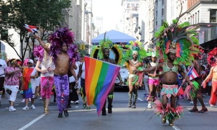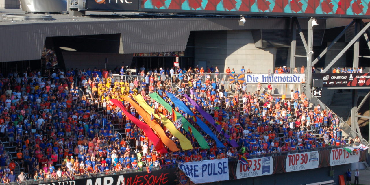 Source Illustration: Hayden Schiff, The Bailey (FC Cincinnati’s fan section) waving rainbow flags and holding colored banners in tribute to the Orlando shooting. Non modifié.