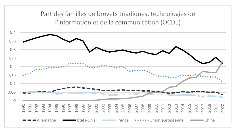 La figure ci-dessous montre qu’entre 1995 et 2006, la part chinoise dans les dépôts mondiaux de brevets triadiques dans le domaine des technologies de l’information et de la communication reste quasiment immuable. Pendant cette période, la Chine est technologiquement inexistante. Ensuite, une ascension remarquable commence, avec un passage de 1 % à 23 en 2020. En cours de route, la Chine n’a pas seulement doublé les pays de l’Union européenne ; les dernières données disponibles indiquent même qu’elle a dépassé les États-Unis.